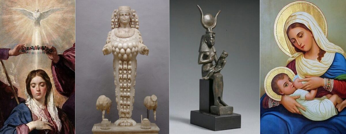 Je všeobecne známe, že obrazy Isis Lactans z neskorého pohanstva sa stali vzormi pre obrazy Matky s dieťaťom, teda Panny Márie s Ježiškom. Katolicizmus nesie rovnakú mytológiu. Napríklad Magharet Sitti Mariam, alebo „Mliečna jaskyňa“, ako je bežne známa, kde podľa katolíckej tradície Mária rozliala mlieko zo svojho prsa, keď kŕmila Ježiša. Toto mlieko údajne strieklo na steny jaskyne a vytvorilo biele škvrny. Jaskyňa sa stala svätyňou, ktorá je dnes uctievaná ako miesto púte za uzdravenie a plodnosť.